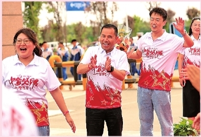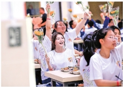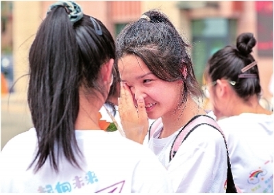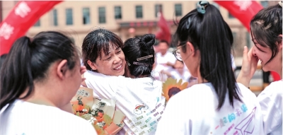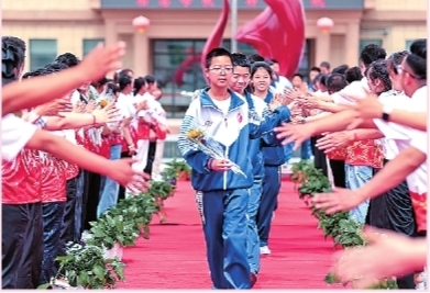 校门口,考生们在两校老师们组成的送考通道和深情祝福中,依次跑过“龙门”,老师和学生一一击掌,深情拥抱。