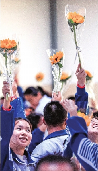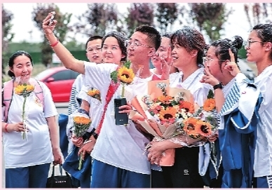 欢送仪式上,全体教师身着中考必胜短袖,为考生们精心准备了向日葵,由校领导及班主任举过头顶,交付学生,预祝考生们一举夺“葵”。随后,全体师生共唱《骄傲的少年》为考生们鼓舞打气。
